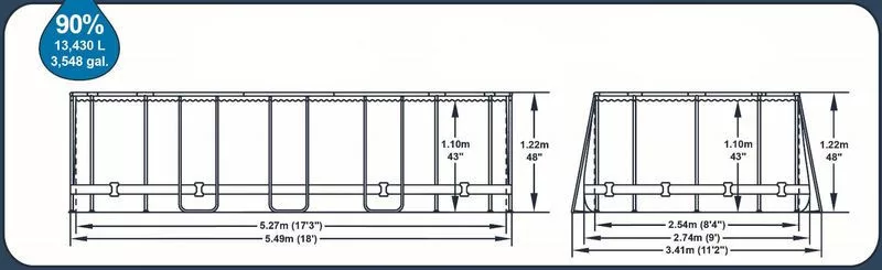 Terméktulajdonságok:• Méret: 5,49 × 2,74 × 1,22 m (ovális)• Kapacitás 90 %: 13 430 l• Anyag: DuraPlus™ PVC + poliészter háló, acélváz• Szín: grafitszürke külső, csempemintás belső• Szivattyú teljesítmény: 5678 l/óra• Súly (csomagolt): 87,67 kg• Rögzítés: Seal & Lock™ csőcsatlakozás• Vízkezelés: állítható ChemConnect™ adagoló