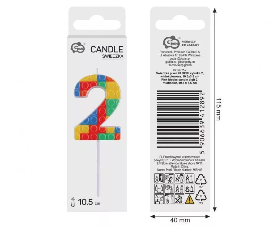 Építőkocka tortagyertya, számgyertya 2-es