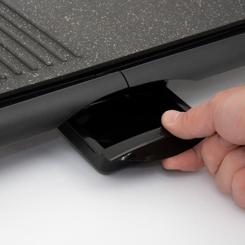 A grill beállítható sütési hőmérséklettel rendelkezik, így könnyen alkalmazkodik a különböző ételek igényeihez. A tapadásmentes bordázott vagy sima felületek kiváló eredményt és változatosságot nyújtanak a grillezett ételekben. A rendkívül könnyen tisztítható kialakítás, a kivehető zsírgyűjtő fiók és a grillezőfelület 52 x 26,5 cm-es mérete maximális kényelmet biztosít a használat során. A grill stabil műanyag állványának gumilábai gondoskodnak a készülék biztonságos elhelyezéséről, míg a hőálló műanyag fogantyúk könnyű és biztonságos mozgatást tesznek lehetővé.