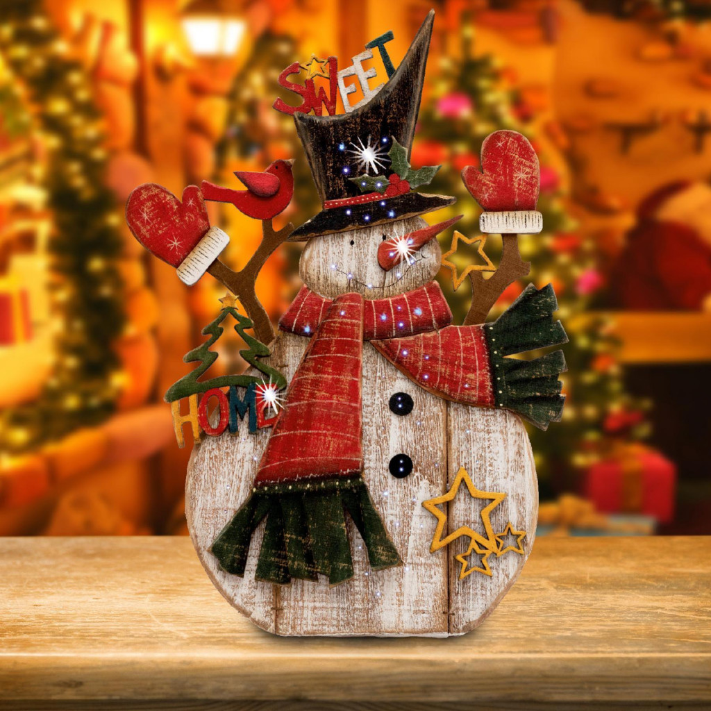 Home KAD 34 optikai szálas asztali dísz, festett fa hóember, színes fénypontok