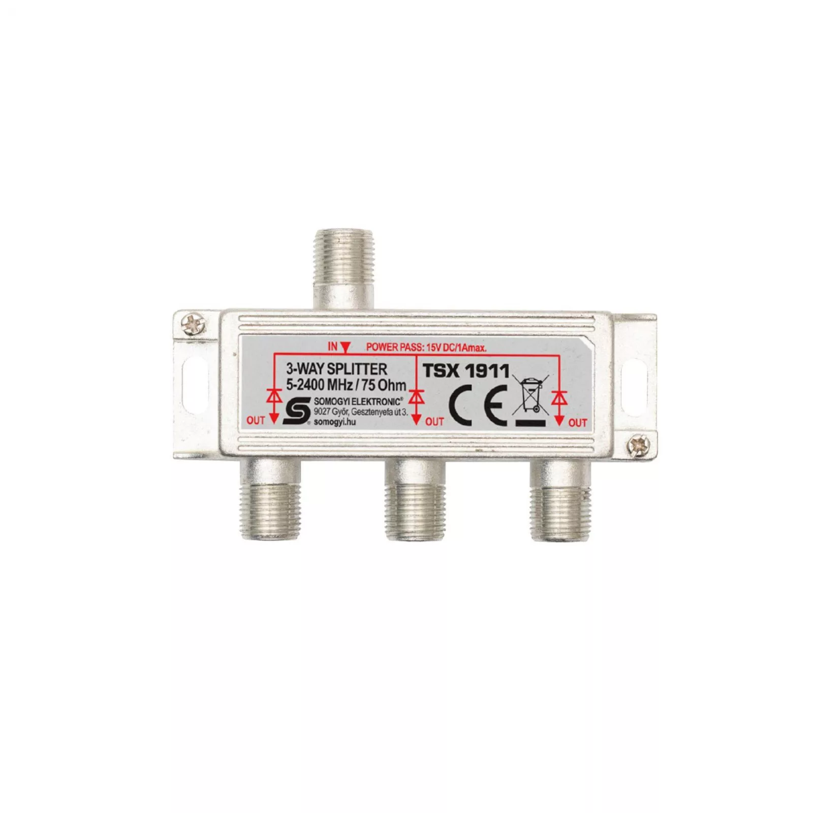 Home TSX 1911 F elosztó, HQ professzionális minőség, 75 Ohm, IP44, cink-ötvözet konstrukció, 5-2400 MHz, 3 utas, 1 bemenet, 3 kimenet